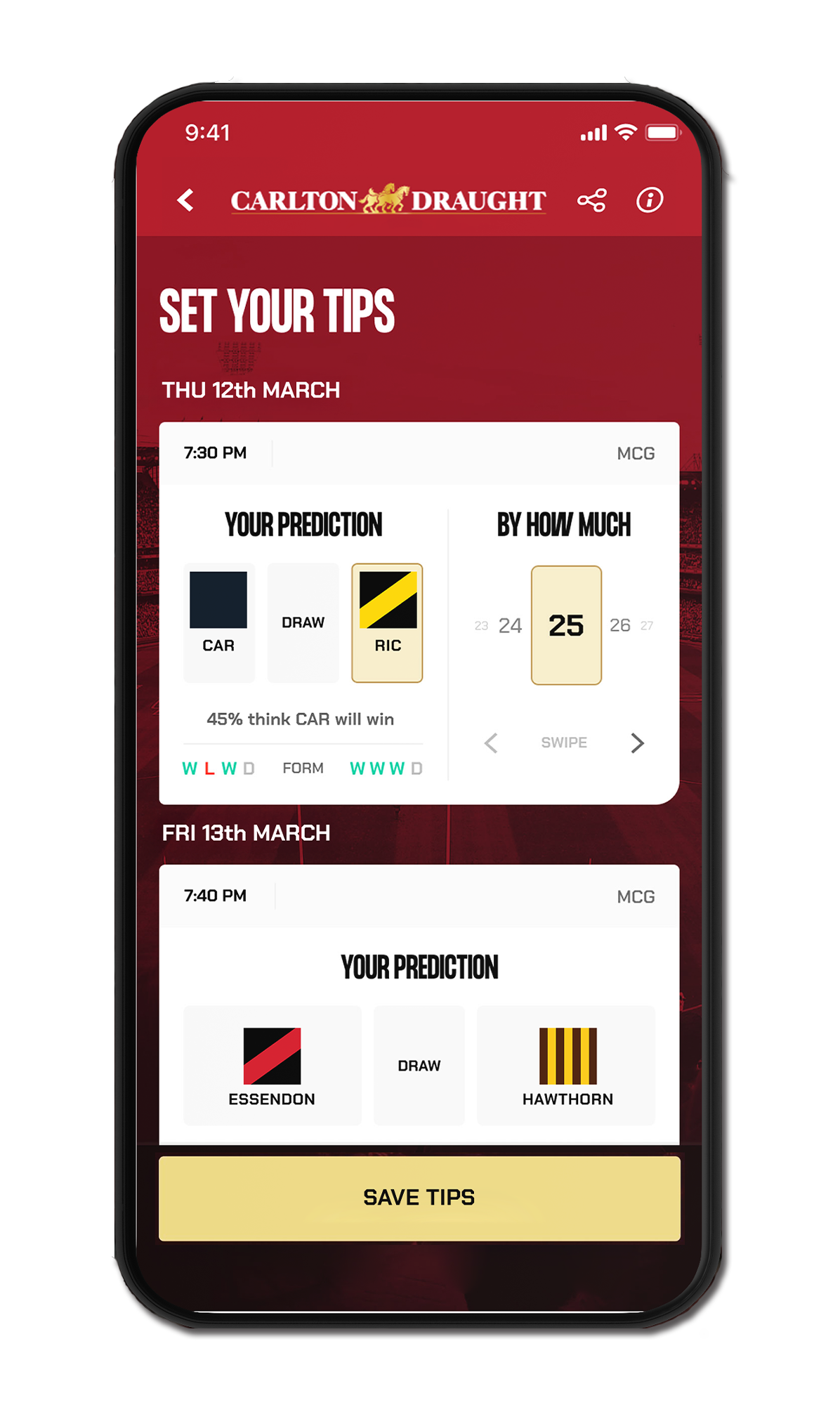 Enter your tips before the first match of each round, and the score margin you predict